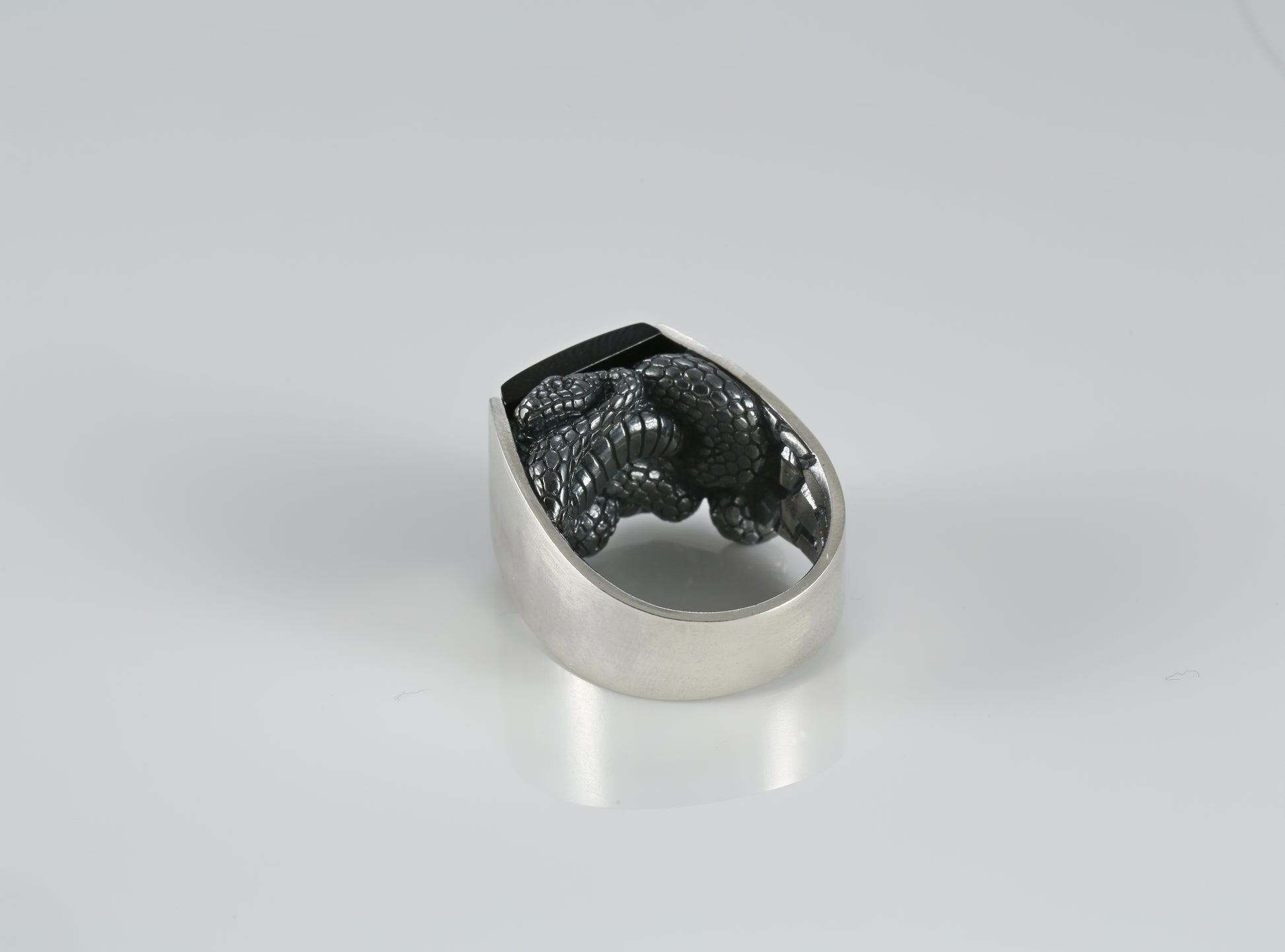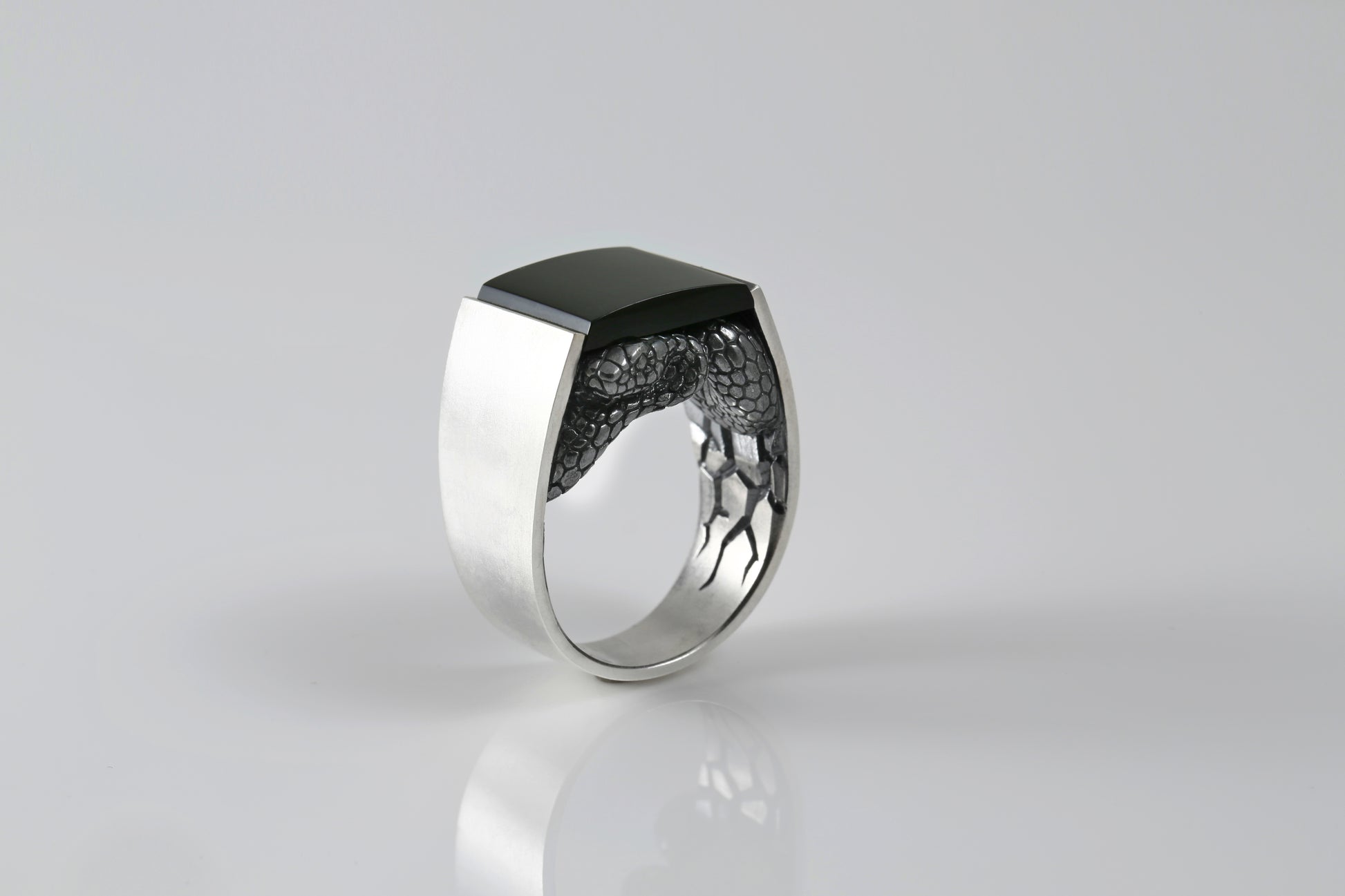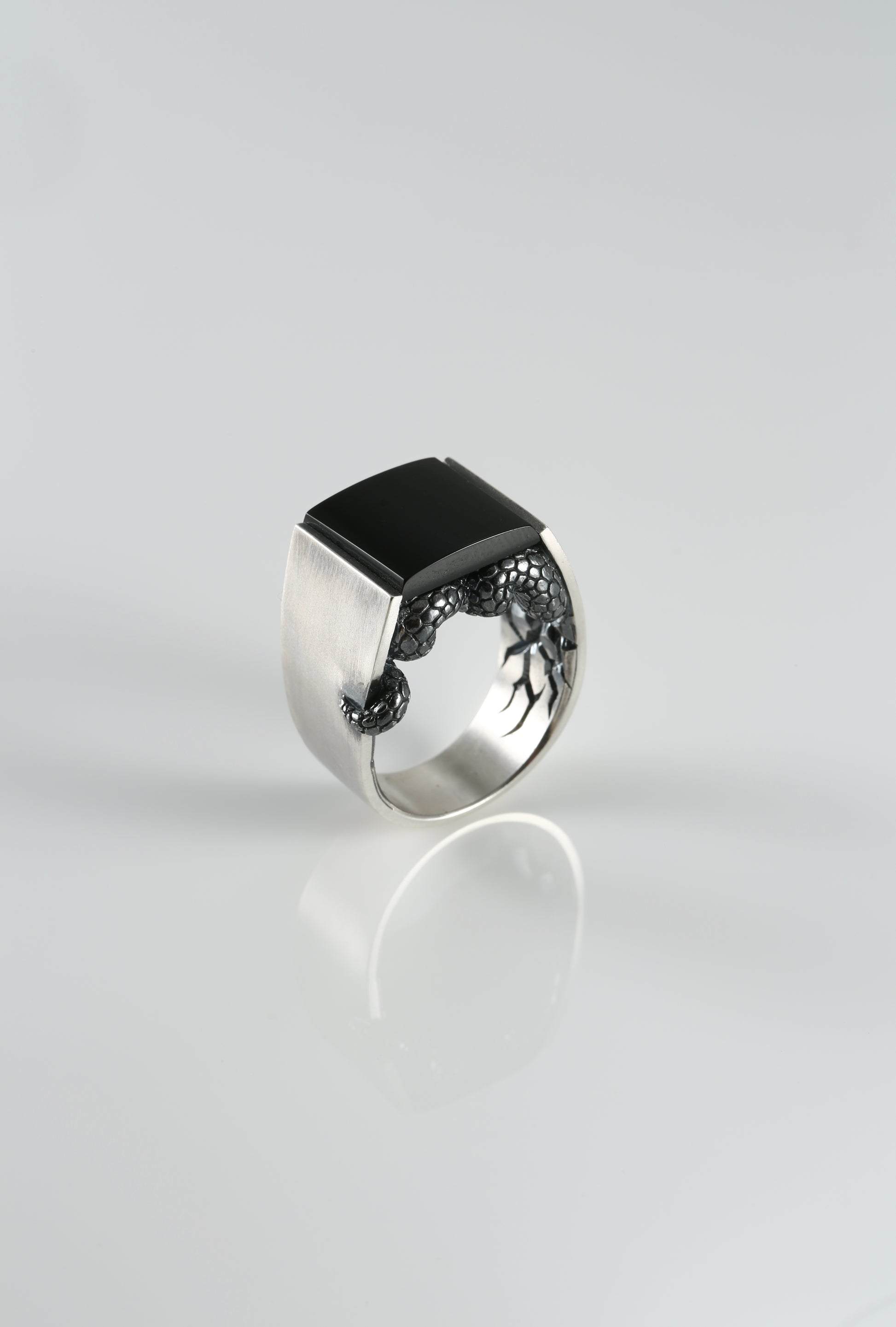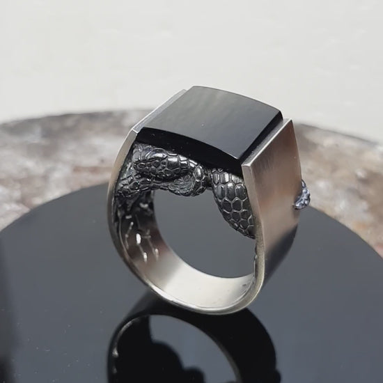 A bold and symbolic piece, this handcrafted ring features a serpent motif coiled beneath a polished rectangular gemstone. Made from solid 925 sterling silver, the ring combines polished and oxidized finishes to enhance the fine details of the snake's scales.