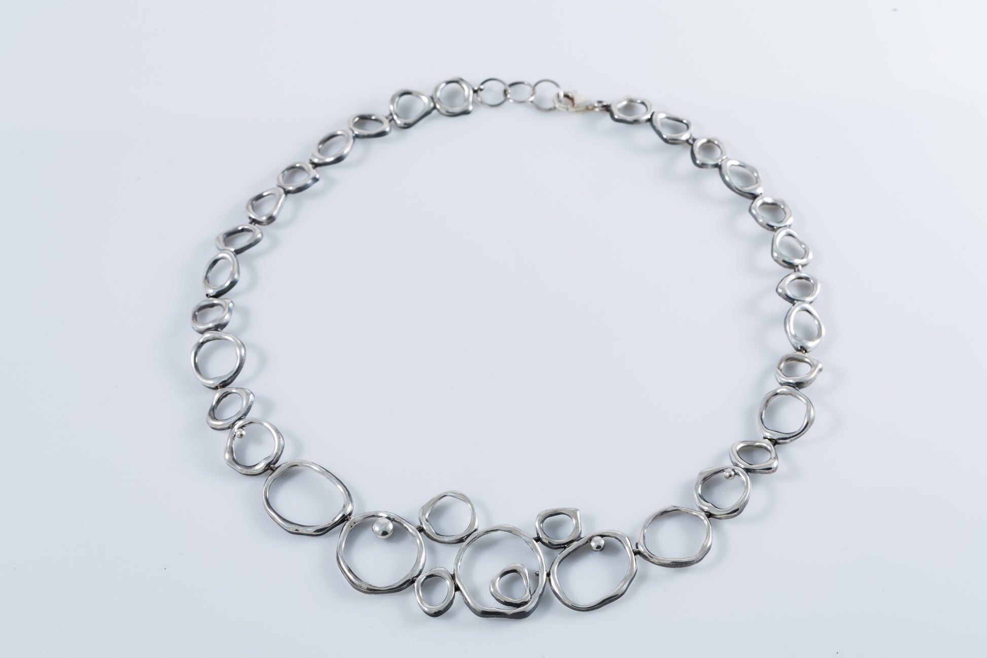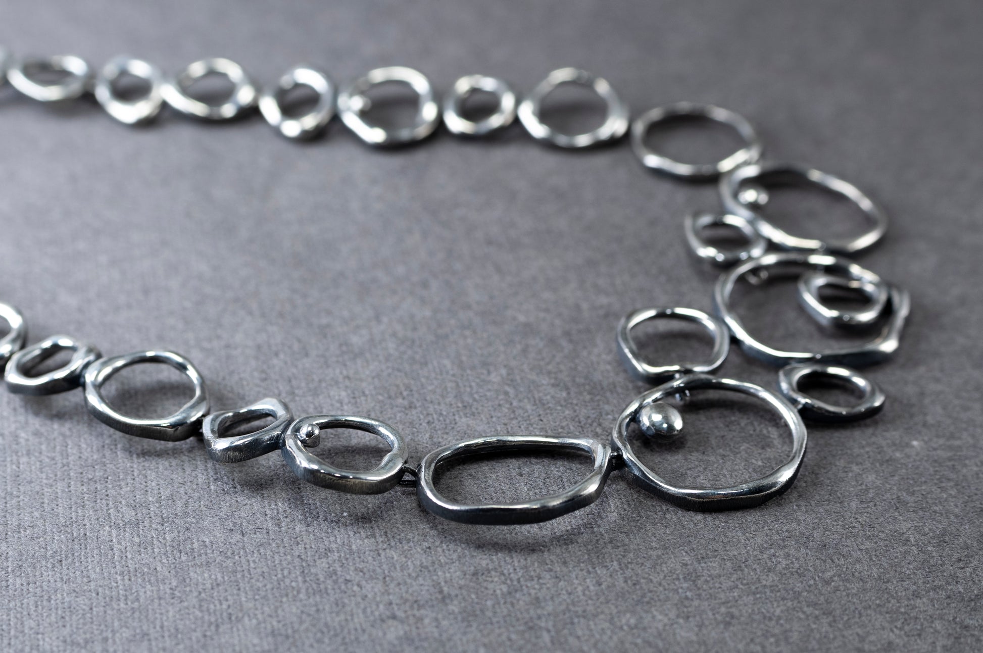 Finished in oxidized silver, the necklace has an elegant yet modern presence.