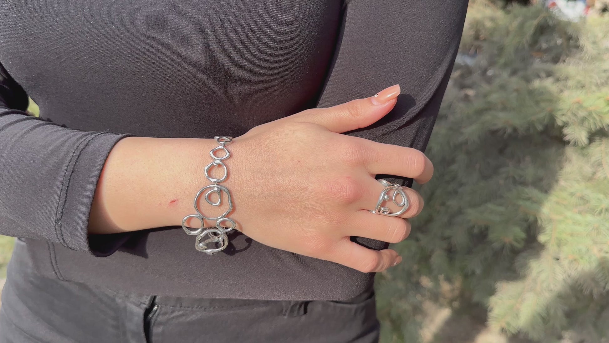 Featuring flowing geometric silver motifs and shimmering carborundum gemstones, this piece reflects lightness, movement, and freedom.