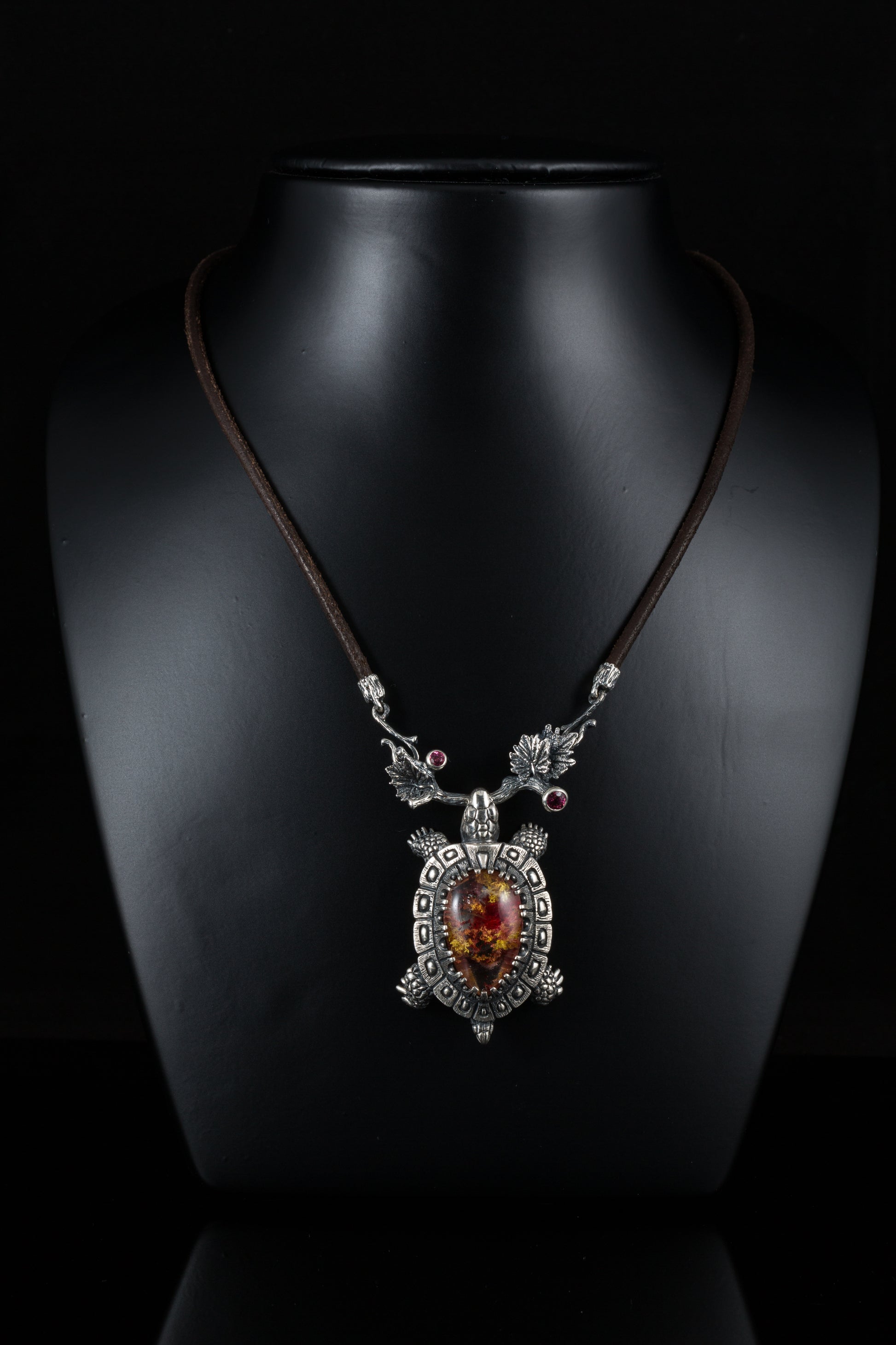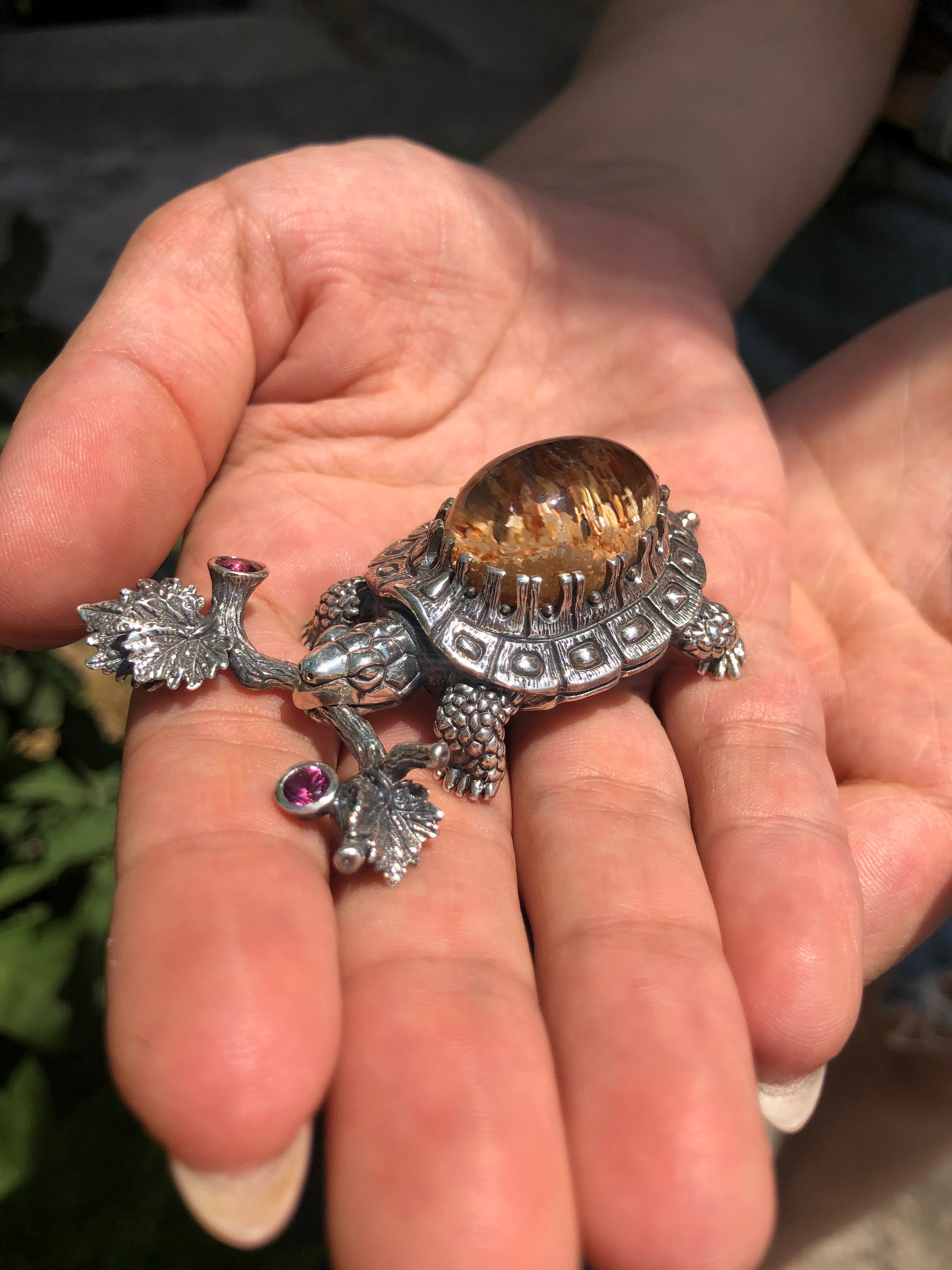 This handmade silver turtle pendant is a true statement piece, featuring natural quartz and tourmaline gemstones. Detailed with nature-inspired leaves and vines.