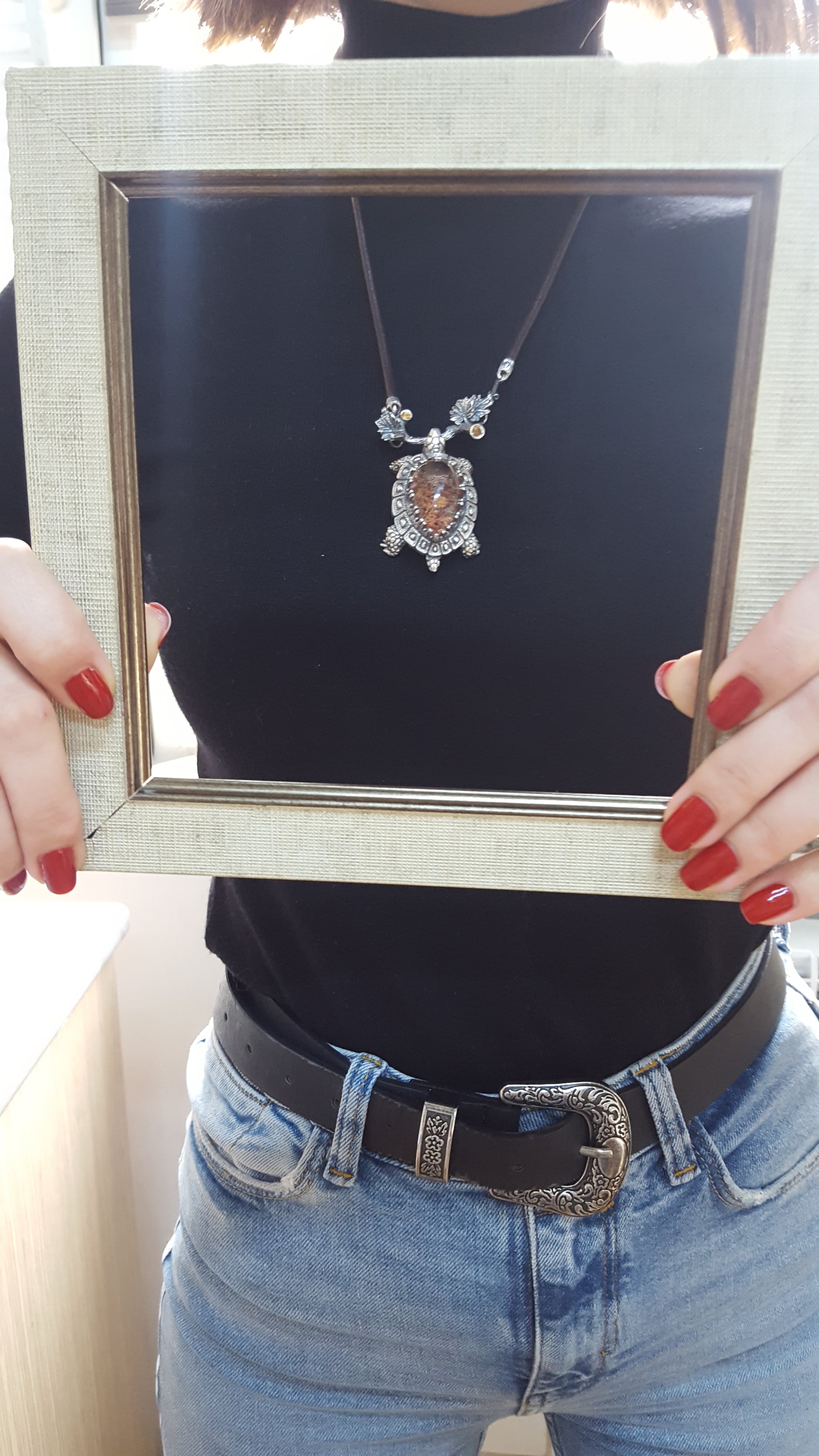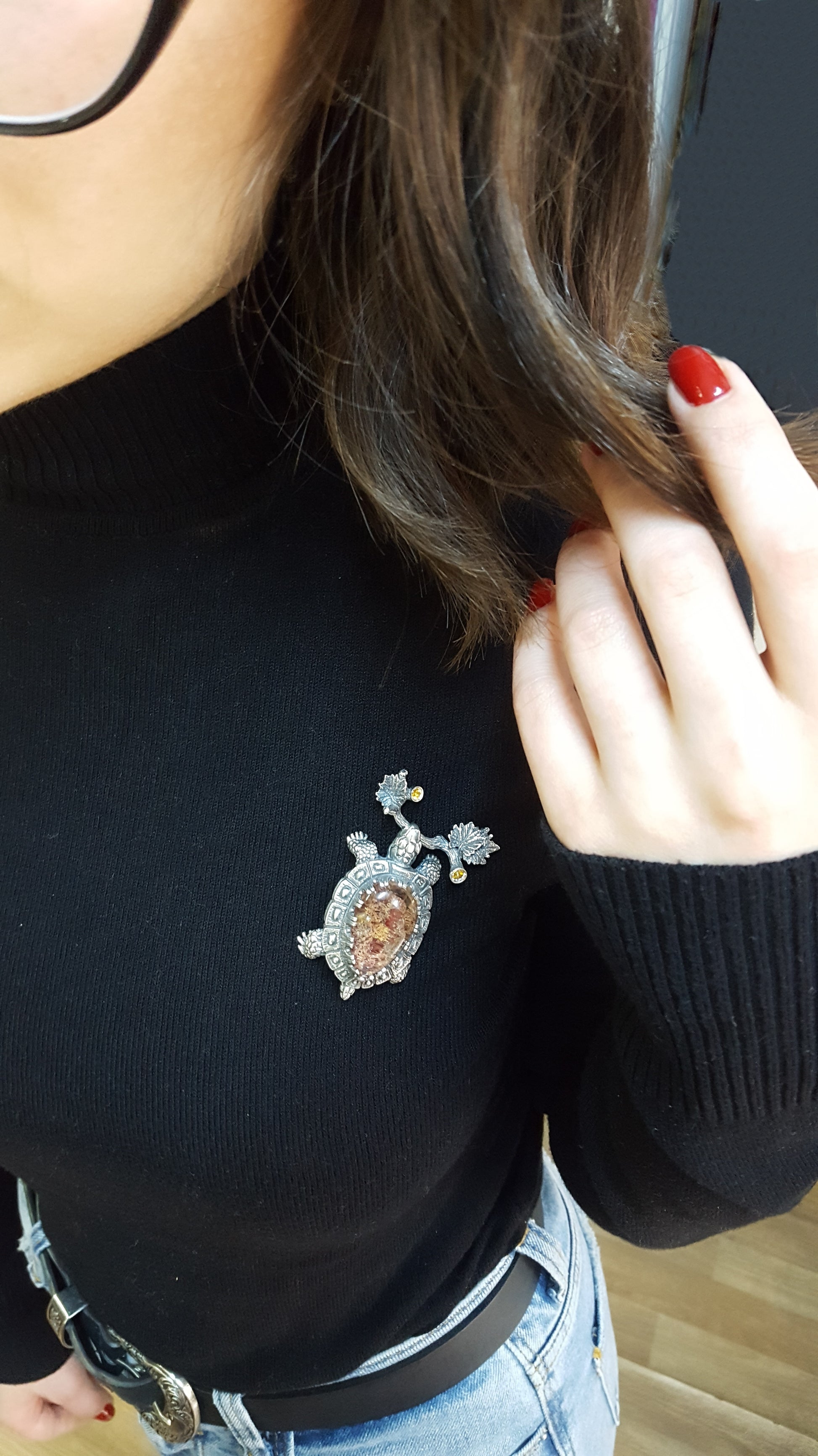 This pendant can be worn as a necklace or a brooch. It makes a meaningful unisex gift for turtle lovers, gemstone aficionados, and collectors of handmade jewelry.